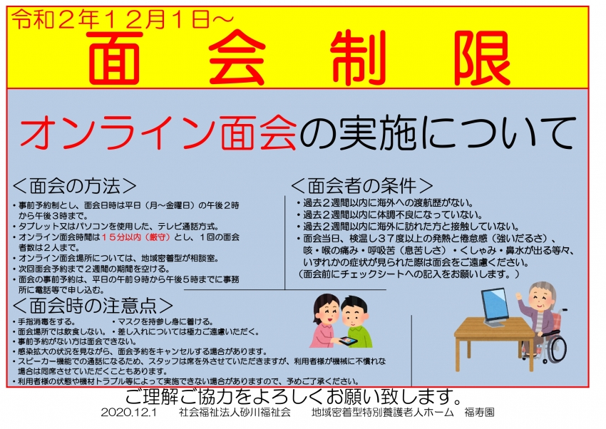 砂川福祉会 ホーム>地域密着型特別養護老人ホーム福寿園(サテライト型)からのお知らせ>オンライン面会について 地域密着型特別養護老人ホーム福寿園(サテライト型)からのお知らせ オンライン面会について 2020.11.17 「地域密着型特別養護老人ホーム福寿園(サテライト型)からのお知らせ」一覧へ戻る