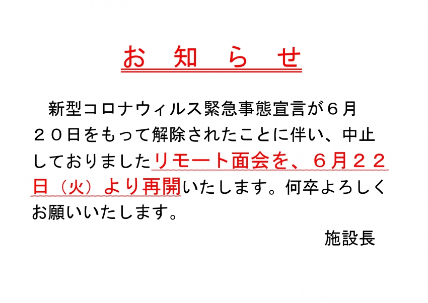 砂川福祉会 ホーム>地域密着型特別養護老人ホーム福寿園(サテライト型)からのお知らせ>緊急事態宣言解除に伴う面会再開について 地域密着型特別養護老人ホーム福寿園(サテライト型)からのお知らせ 緊急事態宣言解除に伴う面会再開について 2021.06.21 「地域密着型特別養護老人ホーム福寿園(サテライト型)からのお知らせ」一覧へ戻る