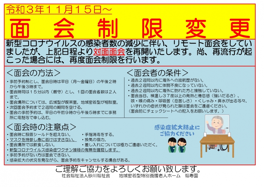 砂川福祉会 ホーム>地域密着型特別養護老人ホーム福寿園(サテライト型)からのお知らせ>面会制限変更について 地域密着型特別養護老人ホーム福寿園(サテライト型)からのお知らせ 面会制限変更について 2021.10.28 「地域密着型特別養護老人ホーム福寿園(サテライト型)からのお知らせ」一覧へ戻る