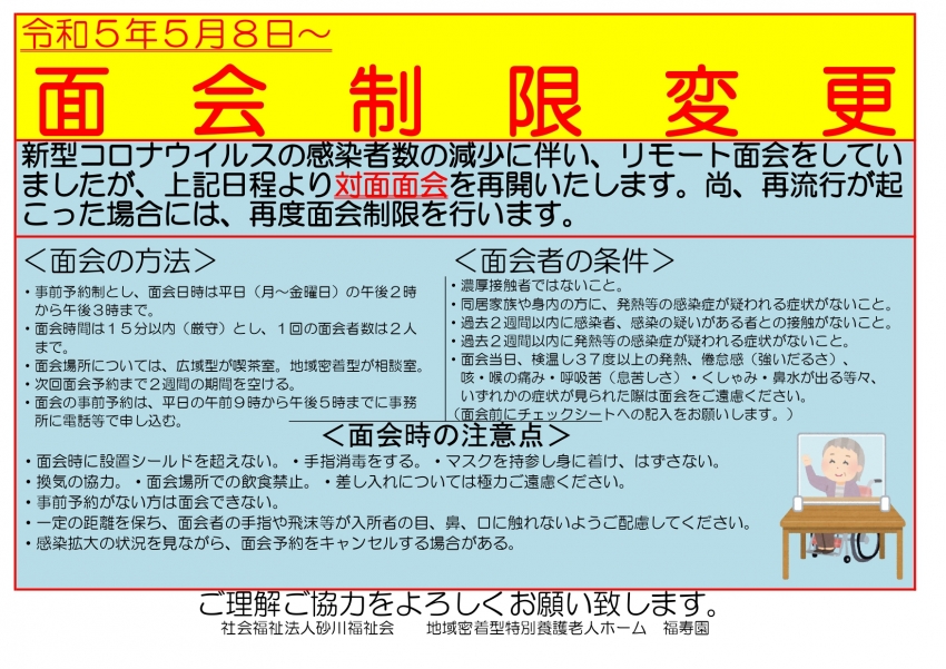 砂川福祉会 ホーム>地域密着型特別養護老人ホーム福寿園(サテライト型)からのお知らせ>面会制限の一部緩和について(再通知) 地域密着型特別養護老人ホーム福寿園(サテライト型)からのお知らせ 面会制限の一部緩和について(再通知) 2024.04.10 「地域密着型特別養護老人ホーム福寿園(サテライト型)からのお知らせ」一覧へ戻る