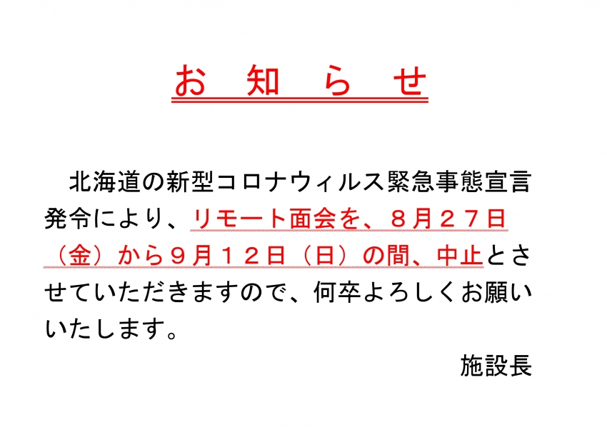 砂川福祉会 ホーム>特別養護老人ホーム福寿園(広域型)からのお知らせ>緊急事態宣言再発令に伴う面会禁止のお知らせ 特別養護老人ホーム福寿園(広域型)からのお知らせ 緊急事態宣言再発令に伴う面会禁止のお知らせ 2021.08.26 「特別養護老人ホーム福寿園(広域型)からのお知らせ」一覧へ戻る