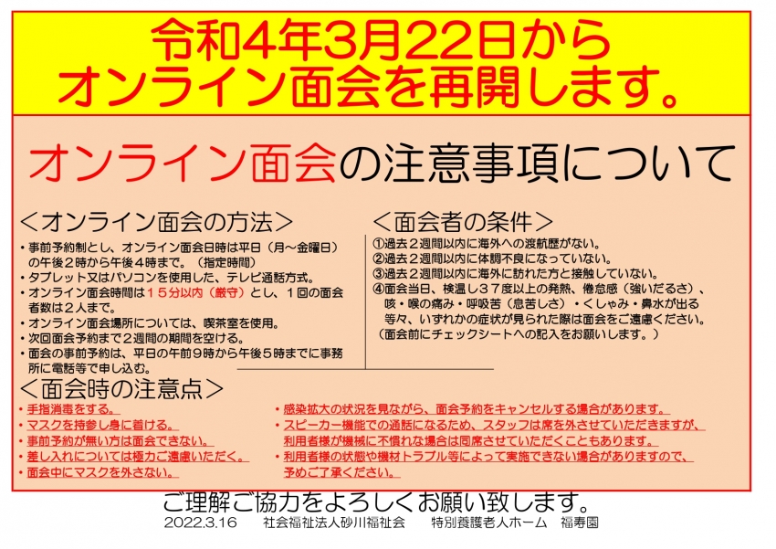 砂川福祉会 ホーム>特別養護老人ホーム福寿園(広域型)からのお知らせ>面会再開のお知らせ 特別養護老人ホーム福寿園(広域型)からのお知らせ 面会再開のお知らせ 2022.03.22 「特別養護老人ホーム福寿園(広域型)からのお知らせ」一覧へ戻る