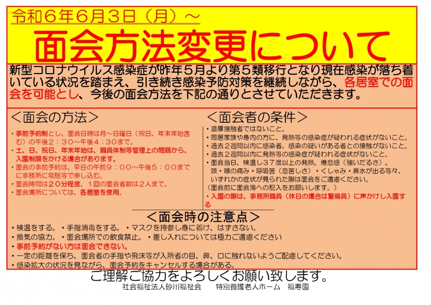 砂川福祉会 ホーム>特別養護老人ホーム福寿園(広域型)からのお知らせ>面会方法変更について 特別養護老人ホーム福寿園(広域型)からのお知らせ 面会方法変更について 2024.05.17 「特別養護老人ホーム福寿園(広域型)からのお知らせ」一覧へ戻る