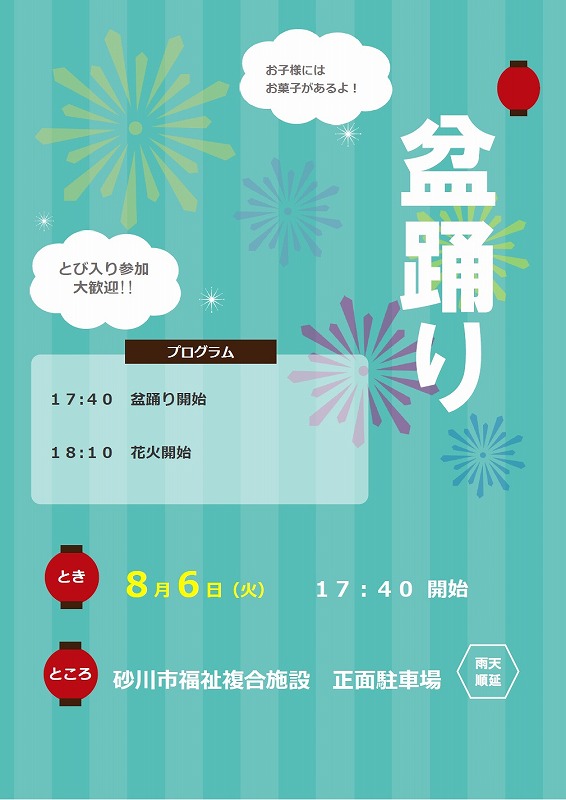 8月6日(火)17:40より、施設前の駐車場を使用し、盆踊り、花火大会を行います。